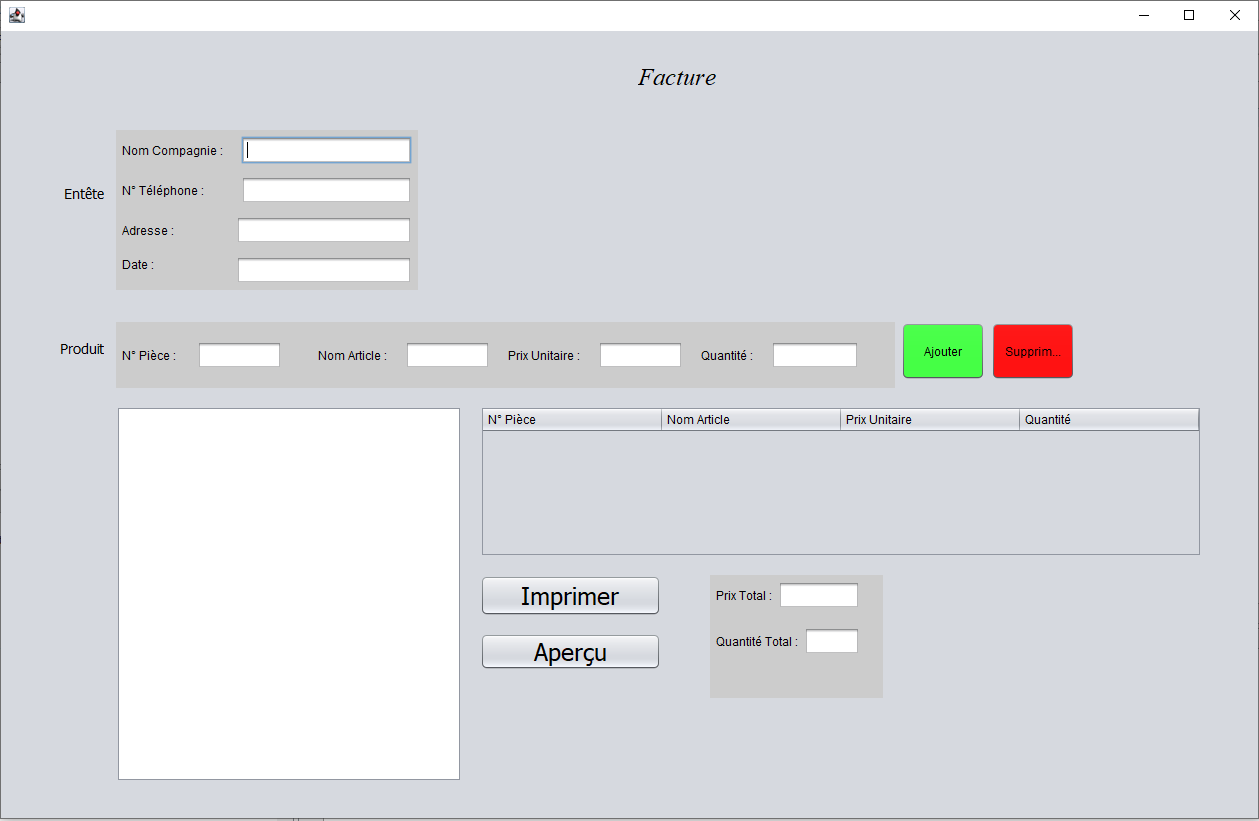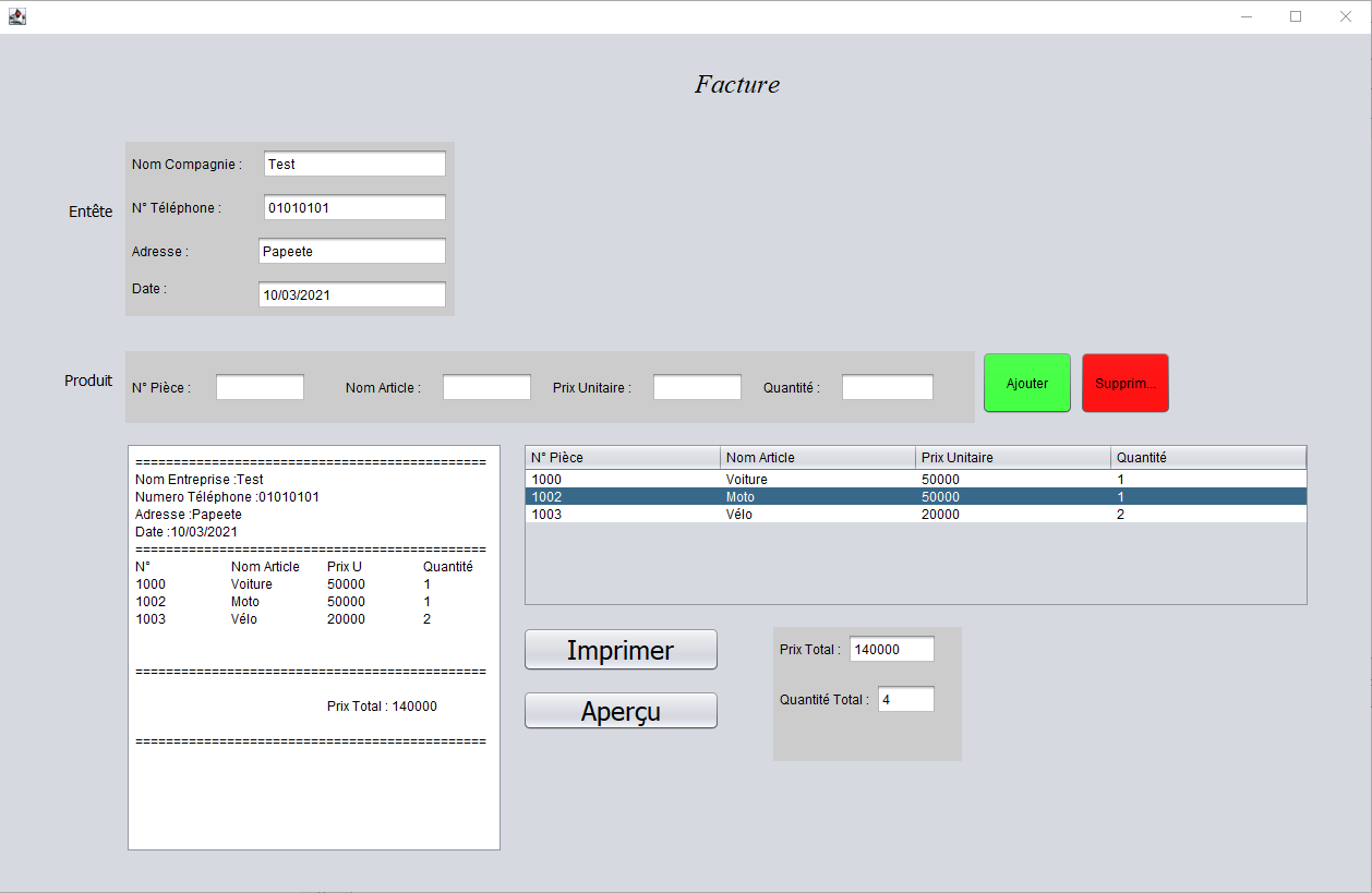 L'application créée une facture en fonction des information saisie dans les champs. Après avoir saisie toutes les information,l'utilisateur a la possibilité de l'imprimer ou te la sortir en PDF.