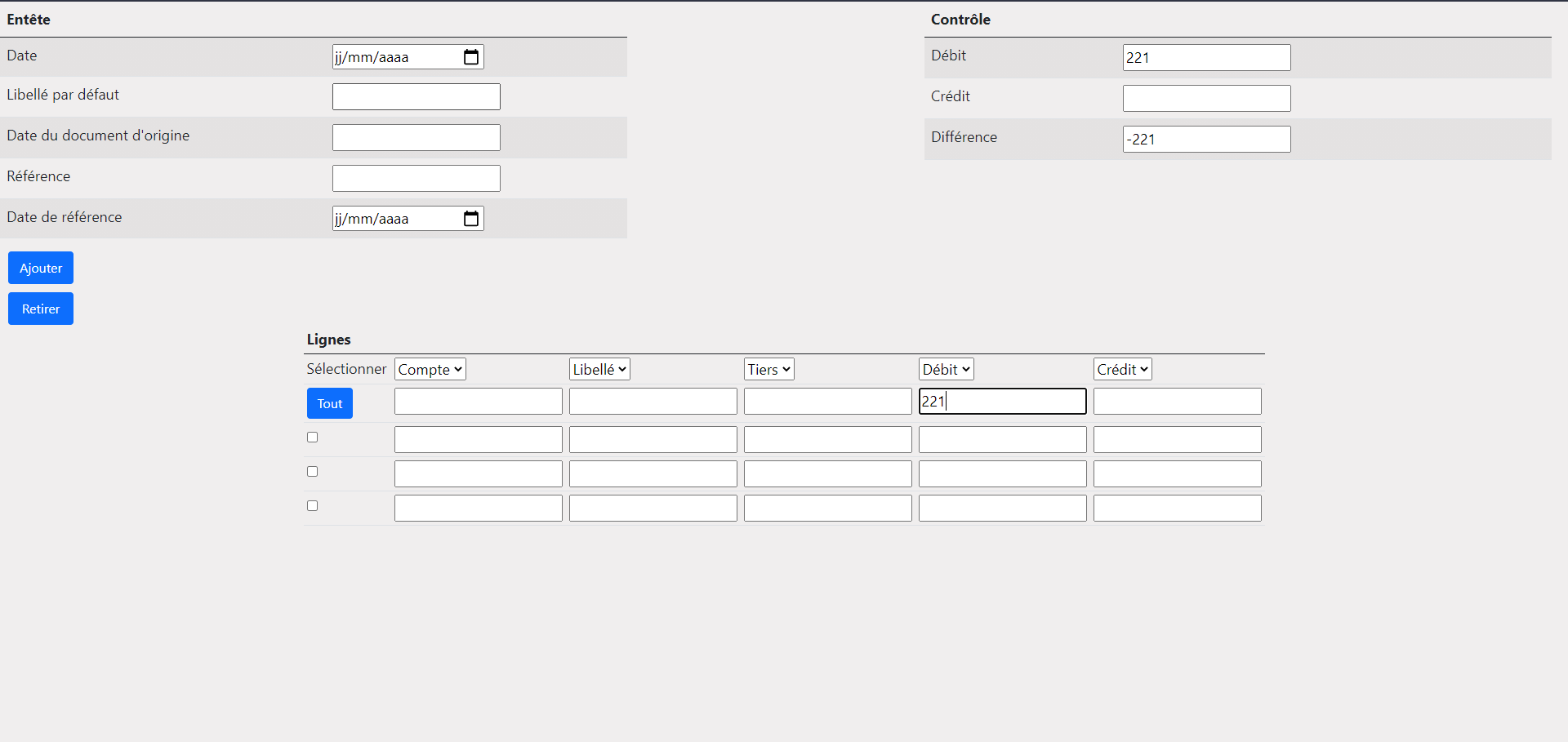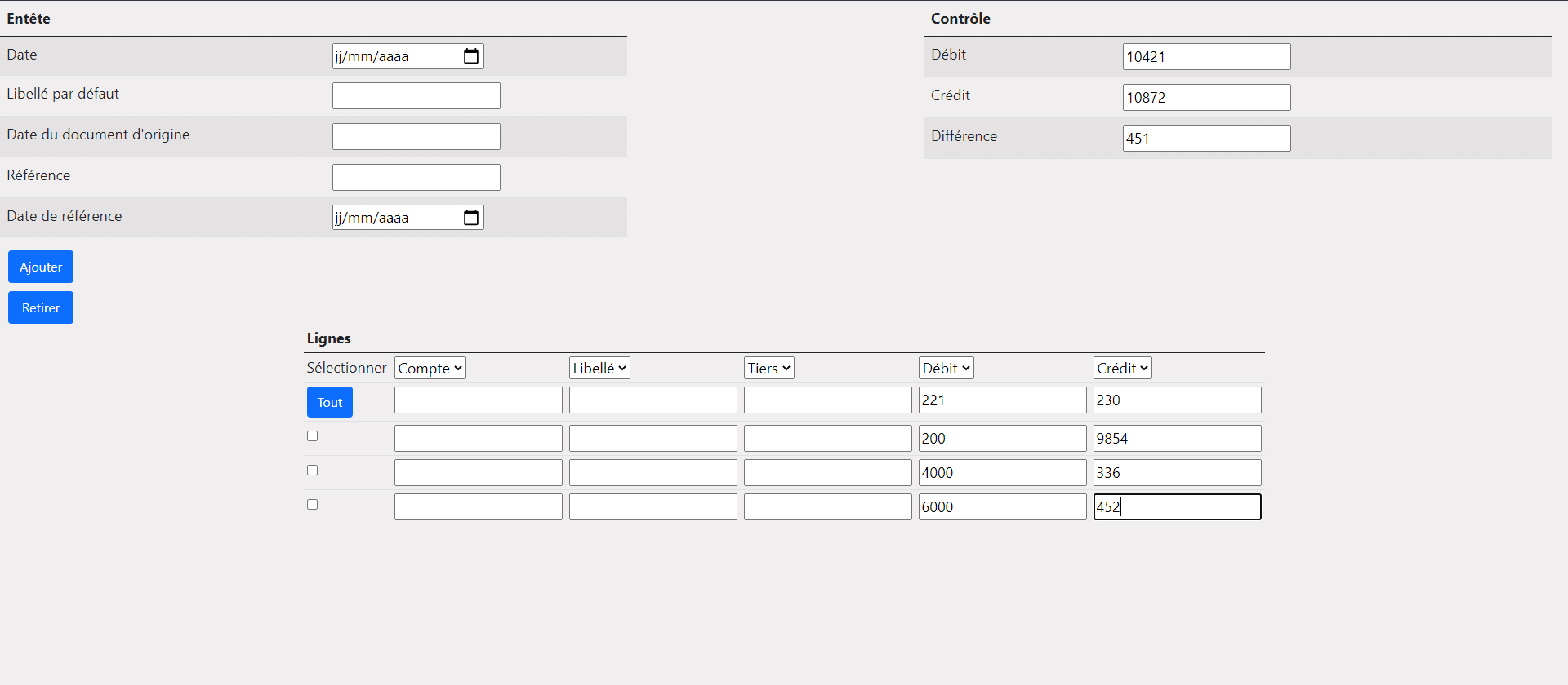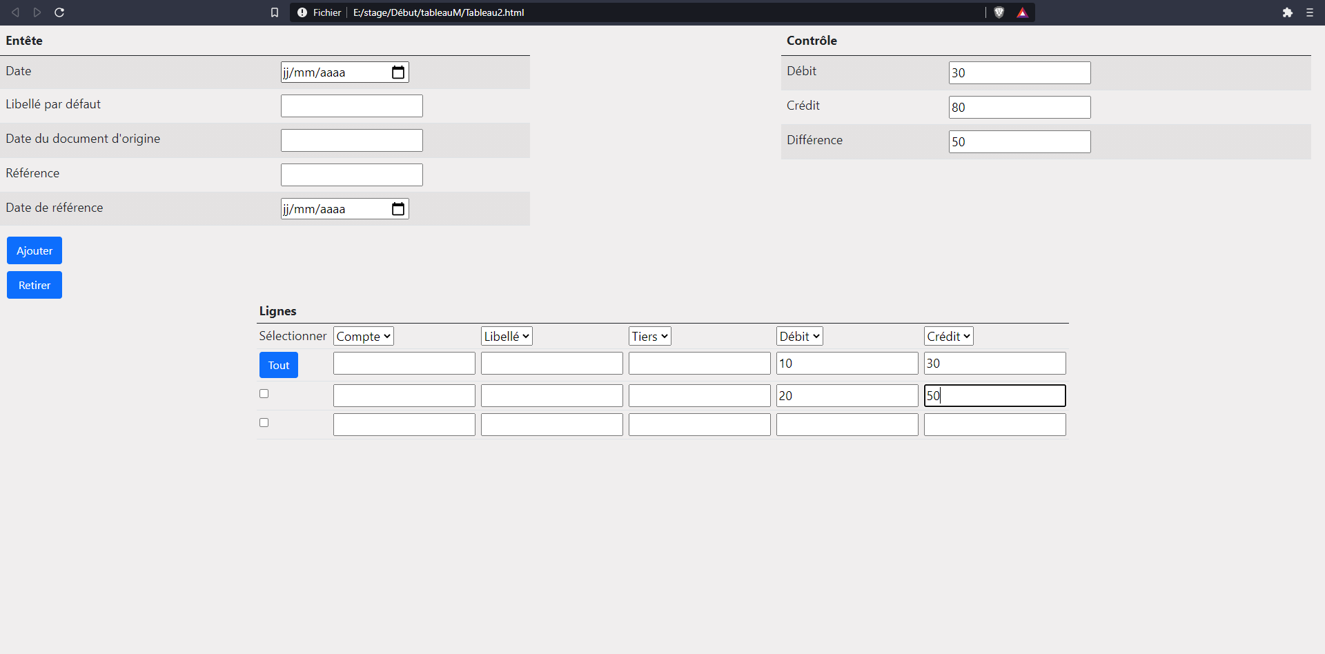 Petite maquette de compte débiter et créditer qui fait la somme de tous les débit et crédit et affiche la différence.